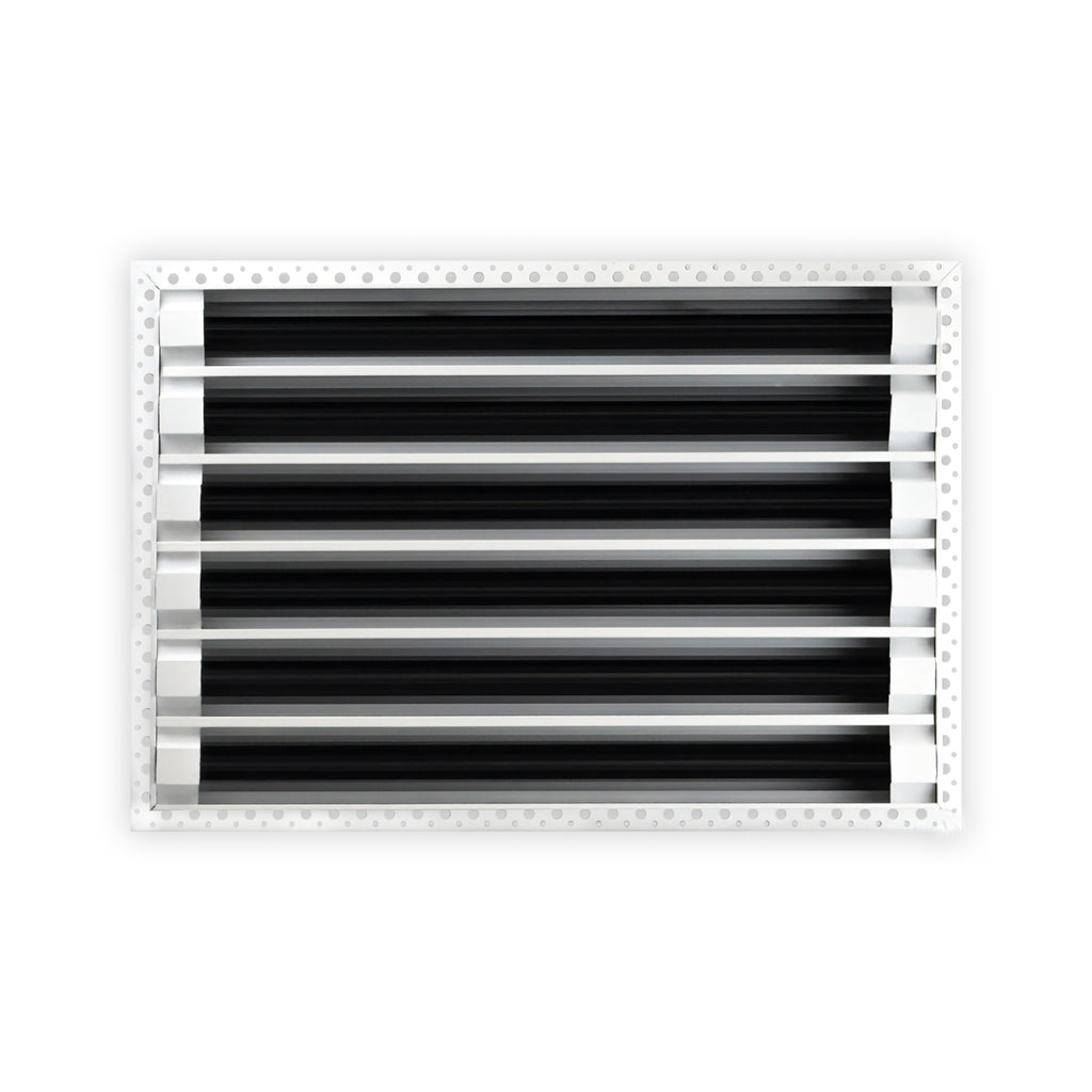 • Texas Buildmart offers Mud In Air Vent Covers also known as Drywall Mud-in White Air Vents. This Mud In Air Vent Cover shoots a 90-degree spread with option to adjust to one side or the other. These have decorative directional dampers. Modern, crisp, clean lines and architecturally appealing. Solid extruded aluminum profile, expertly welded, grinded, and sanded, with reinforcement brackets on the back and a uniform coat of electrostatic paint for a sleek, modern finish and easy maintenance. This white air vent register can be used as a supply air vent cover for ceilings and walls and as a return air vent cover register but looks like a Luxury Drywall Mud-in Vent Cover. If our Mud In Air Vent Cover is used as a Return air vent cover, please make sure the air vent cover is placed in the full open position or remove the directional dampers. Update your Ceiling and Wall Vents with our Mud In Air Vent Covers and it will update the entire look of your Home or Office Space. Rejillas para aire acondicionado de casa blanco. We make all sizes from 6x4 to 30x24 Modern Mud Air Vent Covers for the Modern Day Home. *This is a Design and Utility Patent Pending Product*