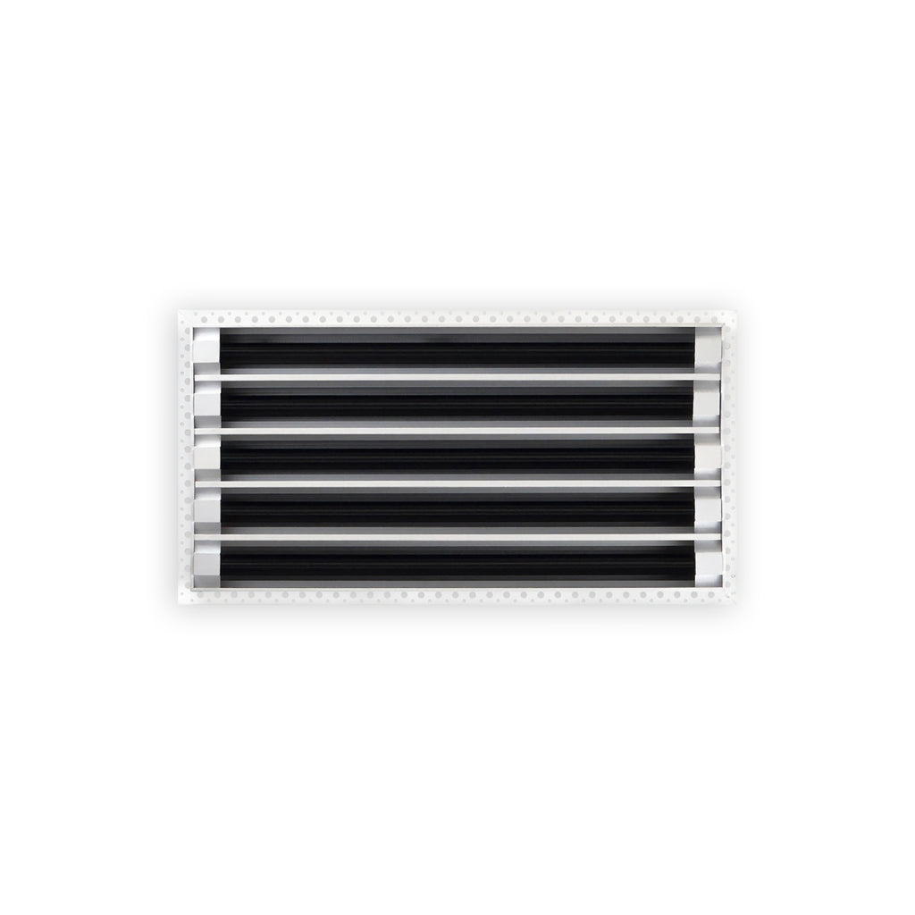• Texas Buildmart offers Mud In Air Vent Covers also known as Drywall Mud-in White Air Vents. This Mud In Air Vent Cover shoots a 90-degree spread with option to adjust to one side or the other. These have decorative directional dampers. Modern, crisp, clean lines and architecturally appealing. Solid extruded aluminum profile, expertly welded, grinded, and sanded, with reinforcement brackets on the back and a uniform coat of electrostatic paint for a sleek, modern finish and easy maintenance. This white air vent register can be used as a supply air vent cover for ceilings and walls and as a return air vent cover register but looks like a Luxury Drywall Mud-in Vent Cover. If our Mud In Air Vent Cover is used as a Return air vent cover, please make sure the air vent cover is placed in the full open position or remove the directional dampers. Update your Ceiling and Wall Vents with our Mud In Air Vent Covers and it will update the entire look of your Home or Office Space. Rejillas para aire acondicionado de casa blanco. We make all sizes from 6x4 to 30x24 Modern Mud Air Vent Covers for the Modern Day Home. *This is a Design and Utility Patent Pending Product*